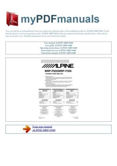 Best alpine mrp f600 f300 user guide Read Online EBook Sites No Sign Up - As we know, Read Online EBook is a great way to spend leisure time. Almost every month, there are new Audio Book being released and there are numerous brand new Audio Book as well.